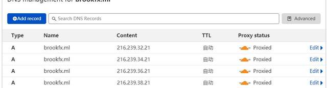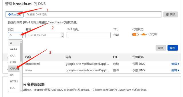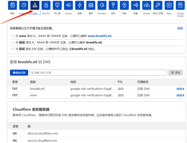1.将我们申请的域名添加到cloudflare并进入DNS页面。如图:
