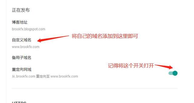 2、返回Blogger找到设置中的HTTPS并打开相应开关即可。如图: