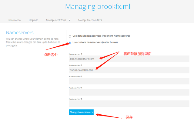 2、Cloudflare 名称服务器alice.ns.cloudflare.com和woz.ns.cloudflare.com添加到freenom所拥有的域名下。方法如下: