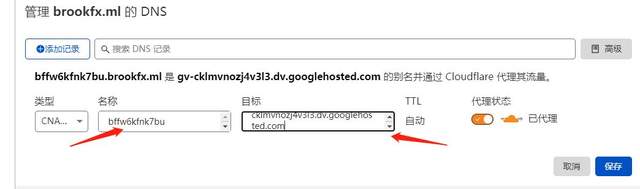 CNAME两条:名称为:bffw6kfnk7bu 对应目标: