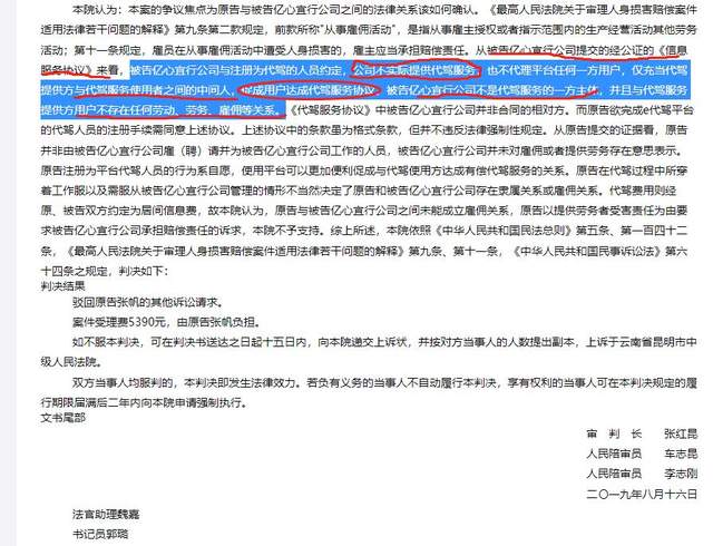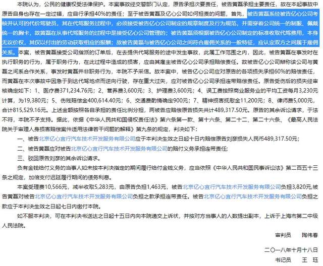 在这个判决中法院通过E代驾提供相关证据,判断E代驾与代驾司机属于雇佣关系。判决E代驾赔付十日内赔偿原告刘某损失人民币489,317.50元;到这里小伙伴觉得也算良心嘛。但我们继续看下面一个案子:
