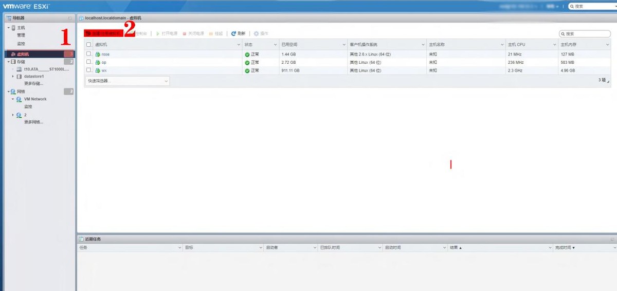 打开ESXI,找到虚拟机(1),点击 (2),选择(3)创建新虚拟机,点击下一页。